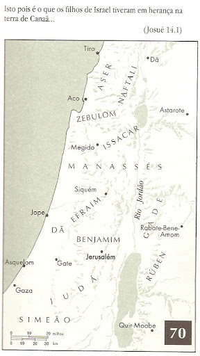 Josué e os chefes das tribos dividiram a terra por sorteio como o Senhor instruíra Moisés: nove tribos e meia a oeste do rio Jordão e duas tribos e meia a leste. Calebe lembrou a Josué que 45 anos atrás os dois haviam obedecido fielmente ao Senhor, se posicionado contra os 10 espias infiéis e que durante todos estes anos o Senhor os havia mantido vivos, conforme a Sua promessa. Durante todo esse tempo ele havia esperado pelo cumprimento da promessa, feita por Deus, de Israel herdar a terra.