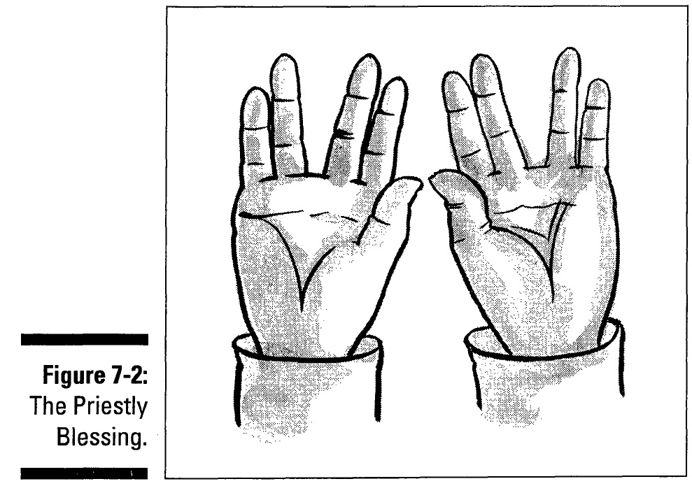 “A tradição judaica ensina que os sacerdotes levantavam seus braços sobre o povo ao abençoá-los. Eles também colocavam os dedos de um modo especial, como mostrado na figura 7-2. Quando os dedos de cada mão eram posicionados adequadamente, eles formavam a letra hebraica “shin” (ש) , que é a primeira letra de Shaddai, o nome de Deus que implica o poder e força infinitos de Deus [Também de Shalom e Shabbat]. ” Arthur Kurzweill, em The Torah for Dummies, p. 118-119.